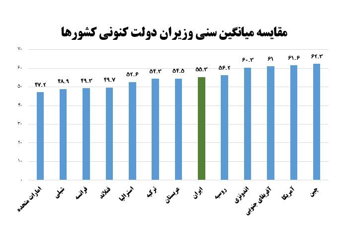 بر همین مبنا یعنی با محاسبه سنی فقط وزیران کابینه میانگین سنی دولت کنونی ما ۵۵.۳ سال است. (جوان‌ترین وزیر ۴۲ سال و مسن‌ترین ۶۴ سال) این میانگین توانست سیر صعودی سن ۱۲ کابینه پیشین را نه تنها متوقف بلکه چند سالی نیز کمتر کند.